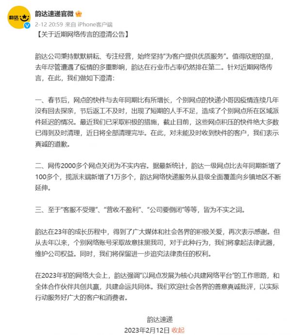 闪崩的源起是一则关于韵达的新闻——2月12日,韵达快递官微博发布公告,对近期网络的传言进行了澄清,网传2000多个网点关闭为不实内容。