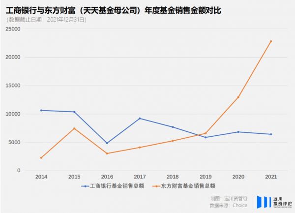 2021年底,天天基金的公募销售保有规模超越工商,排在了招商银行与蚂蚁基金之后。“宇宙行”终究在基金销售业务上被挤出了前三甲。但如果观察工商银行与东方财富(天天基金母公司)历年财报中基金销售额的变化,就会发现,这样的情况其实早在2019年,甚至在更早的2017年就有预兆了。