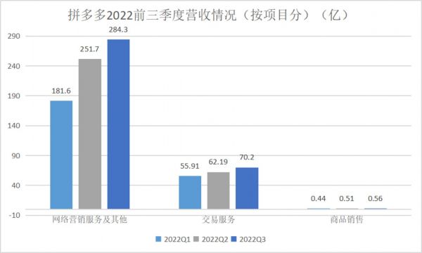 拼多多2022前三季度营收情况(按项目分)(亿) ,数据来源:Choice ,一刻商业制图