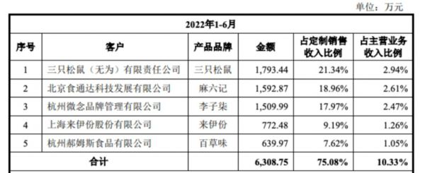 截至2022年1-6月,三只松鼠、麻六记、李子柒、来伊份和百草味是其排名前五的代工品牌。三只松鼠作为阿宽食品的最大代工客户,销售金额为1793.44万元。
