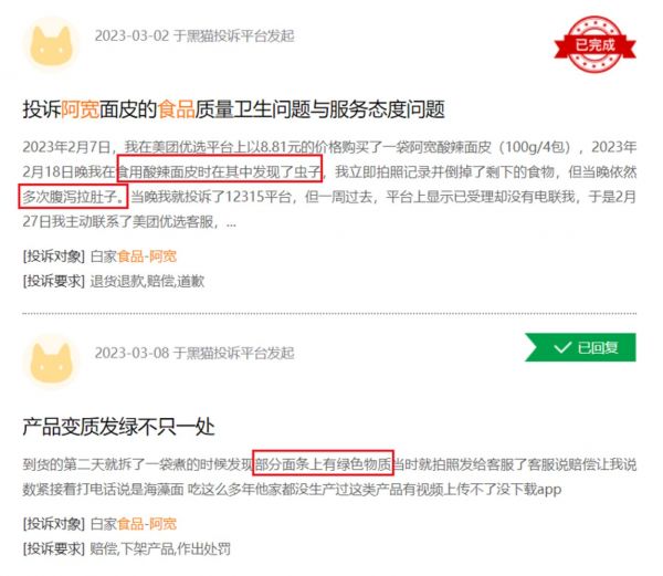 此外,在第三方投诉平台黑猫投诉上,也有大量与阿宽食品有关的投诉,累计投诉量高达上百条,其中大部分消费者的投诉问题都集中在产品中存在虫子、毛发、异物等问题上。