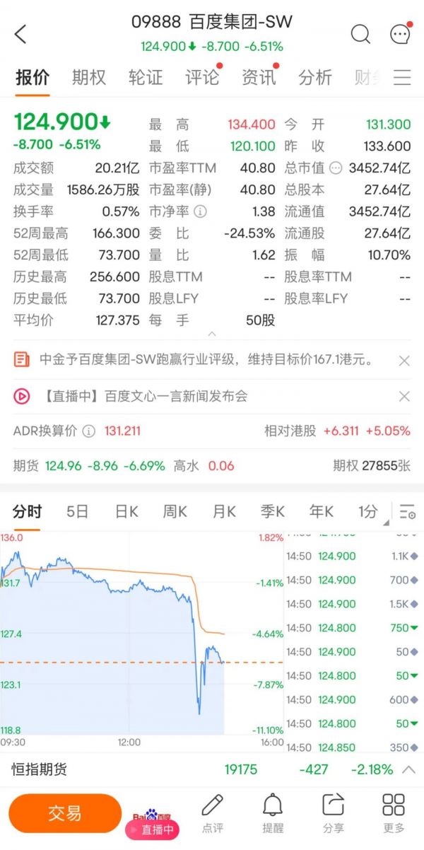 百度步谷歌后尘:文心一言发布,股价最高跌去近10%