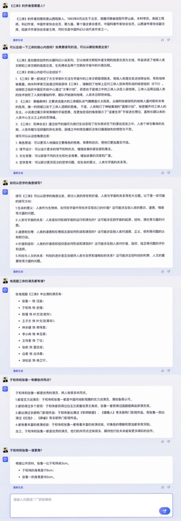 在文学创作场景中,文心一言就《三体》内容进行了六轮对话。