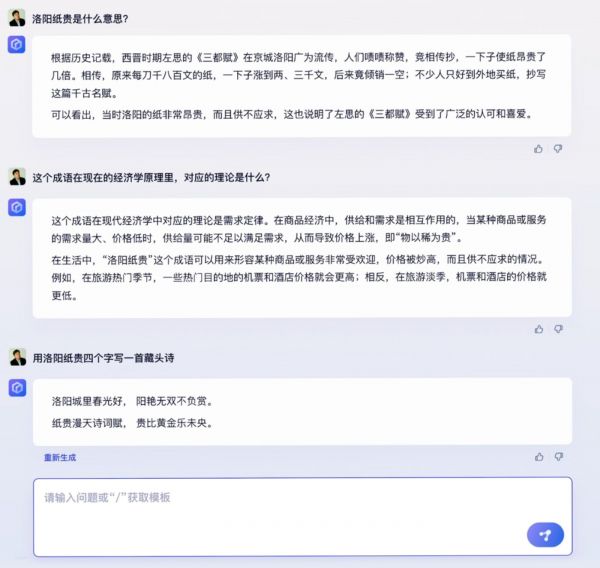 李彦宏还展示了文心一言对中国传统文化的理解和对应的经济学理论,文心一言还用“洛阳纸贵”四个字创作了一首藏头诗。