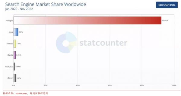 在搜索引擎中,微软Bing是一个挑战者的身份。根据statcounter数据,2022年Bing搜索引擎的市场份额只有2.8%,远远落后于谷歌搜索的92.04%。