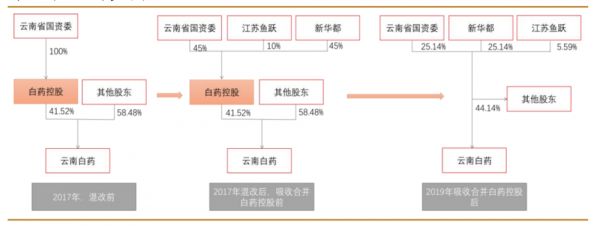2017年3月,新华都集团耗资254亿元增资云南白药的大股东白药控股,持有其50%股权。同年6月,云南省国资委再度引入江苏鱼跃,国资委、新华都、江苏鱼跃分别持有白药控股45%、45%、10%的股权。2018年,云南白药正式启动整体上市计划,吸收合并白药控股,最终国资委、新华都、江苏鱼跃分别持有云南白药25.14%、25.14%和5.59%的股份。