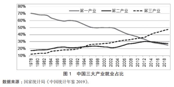 中国是从贫穷落后的农业大国一路走来的,长期以来,就业问题实际上是农业国工业化的发展问题。1980年我国农村人口占81%,第一产业就业占比高达68.75%。提高农业劳动生产率以及农民收入,与工业部门吸收农村剩余劳动力是同一硬币的两面。图1显示了过去40年三大产业就业占比的变化。过去40年三大产业就业占比的变化。
