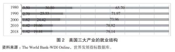 比如,美联储货币政策越来越容忍通胀,却高度关注就业状况。就业作为发达国家宏观政策的主要目标,与其成熟的产业结构有关。如图2所示,美国第一产业就业占比已从1980年的3.5%下降到2010年1.42%,此后维持不变,表明美国农村剩余劳动力已所剩无几。