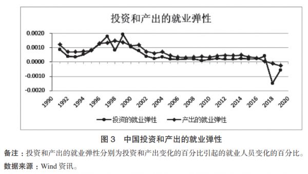 在中国,随着第二产业减员和规模扩张型工业化时代的结束,中国固定资产投资与GDP增长的就业弹性已趋零甚至出现了负值。图3显示,2018年~2019年增量固定资产投资和GDP增长的就业弹性出现负值,刺激固定资产投资和经济增长的宏观经济政策创造就业的效应减弱。