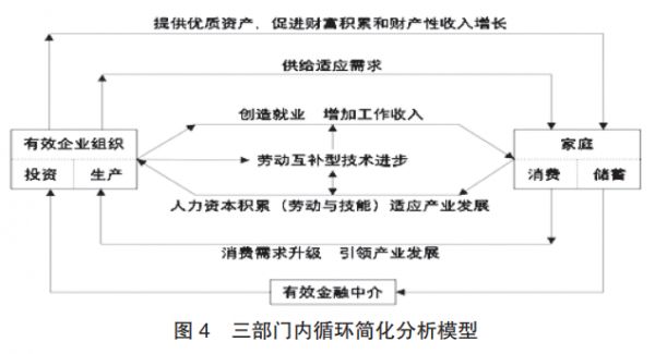 中间循环是消费导向的商品与服务市场的供求平衡和相互促进。以市场为导向的经济活动由家庭消费升级需求引领产业发展,企业提供有效供给以适应需求。家庭消费及其升级取决于家庭工作收入和财富的积累与分配,后者取决于内核循环中劳动市场供求及其决定的初次分配,以及外围循环中金融中介服务实体经济发展的有效性。