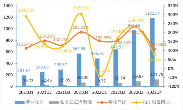 分季度来看,2022年公司营收与利润主要来自下半年的贡献,下半年公司营收与扣非归母净利润分别为2156.23亿元和211.62亿元,分别占全年的65.62%和75.01%,其中仅四季度公司营收与扣非归母净利润就已分别达到2021年全年的90.72%和157.43%。
