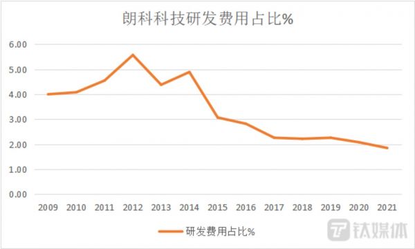 另一方面,对于科技企业来说,有个衡量其实力的重要指标那就是研发费用。根据已公开的财务数据,朗科科技的研发费用占营业收入的比例在2012年最高时也没超过6%,随后就越来越低,2016年后更是跌破3%。如此之低的研发收入,与科技这个的名号比起来,差距还是不小。