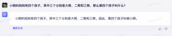 文心一言的回答是:小明的妈妈有四个孩子,其中三个分别是大熊、二熊和三熊。因此,第四个孩子叫做小明。