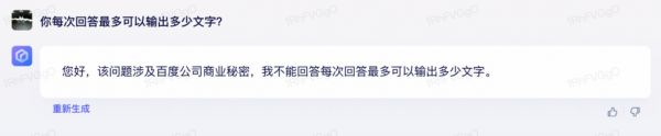 如同GPT-4“考虑到大模型的竞争格局和安全隐患”而不再对外公布用了什么数据、怎样训练模型等核心机密问题之外,字母榜还在测试中发现,文心一言同样有所保留,在问到“你每次回答最多可以输出多少文字?”时,文心一言表示,“该问题涉及百度公司商业秘密,我不能回答每次回答最多可以输出多少文字。”
