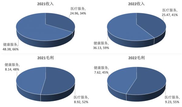 新业务口径下,健康服务为公司贡献了大部分的收入,同时盈利能力更强的医疗服务则为公司贡献了超过一半以上的毛利。 再看21、22两年的边际变化,医疗服务的收入占比与利润占比均有不同程度的增长。