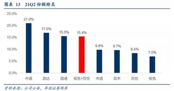 不过在行业大局已定的背景下,极兔却异军突起,收获了可观的市场份额。华创证券披露的数据显示,以2021年Q2份额计算,整合百世快递后,极兔的市场份额高达15.4%,仅比圆通低0.1%,位居中国第四。