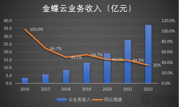 财报显示,2022年云服务业务实现收入同比增长34.6%至37.14亿元,占比集团收入约76.3%,2016-2022年,金蝶云业务增速也从历史最高点的103%回落至35%,据钛媒体App计算,年复合增长率达到了49%。