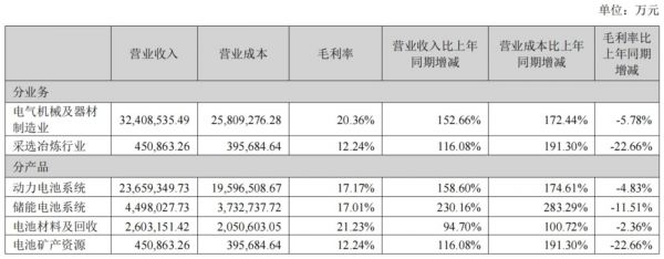 2022年,宁德时代动力电池业务毛利率有所下降。财报显示,在宁德时代营收中占比72%的动力电池业务,毛利率从2021年的22%下滑至17.7%,减少4.83个百分点。此外,由于营业成本增幅较大,宁德时代的各项业务毛利率同比均有不同程度下降。