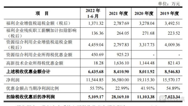 值得注意的是,金龙股份录得的净利润并非全部来源于经营收入,有相当一部分来自于税收优惠。金龙股份享受的税收优惠政策主要包括高新技术企业税收优惠、福利企业税收优惠、资源综合利用税收优惠等。2019年至2021年及2022年上半年(以下简称“报告期内”),金龙股份所得税收优惠金额合计分别为8546.83万元、8011.92万元、8410.9万元、6435.68万元,占当期净利润比例分别为54.89%、41.91%、22.99%、55.75%。也就是说,扣除税收优惠后金龙股份所得净利润为7023.34万元、11103.38万元、28169.1万元、5109.17万元。
