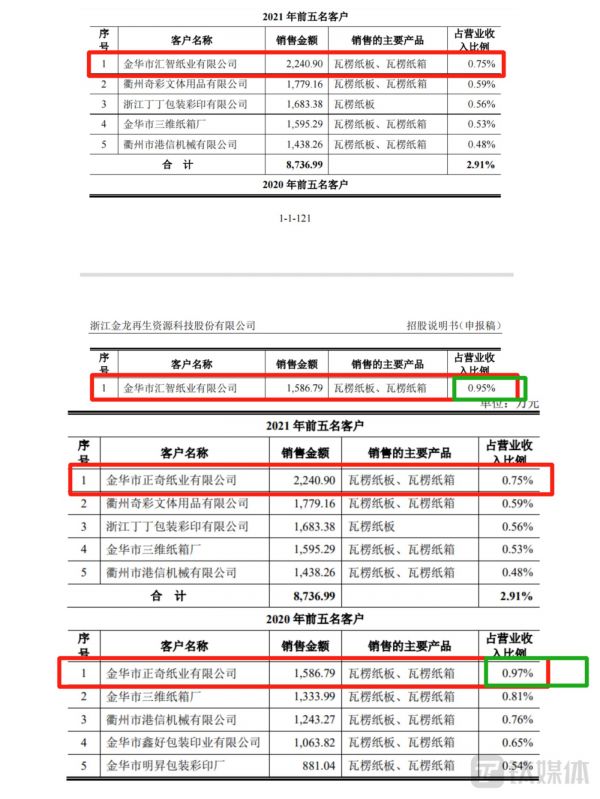钛媒体APP对比此前招股书发现,汇智纸业并未出现在纸制品业务前五大客户中,取而代之的是金华市正奇纸业有限公司(以下简称“正奇纸业”),2020年与2021年对金龙股份的采购金额与汇智纸业相同,仅2020年的营收占比出现差别,为0.97%。汇智纸业与正奇纸业又有什么联系?企查查显示,两家公司的法人均是郭家森,且正奇纸业已于2022年7月14日被注销。既然不是同一家企业,金龙股份为何前后两版招股书披露的信息不一致?其中又藏有什么秘密?