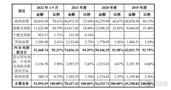 从营收上来看,容大感光主营业务收入主要来源于阻焊油墨,湿膜光刻胶,干膜光刻胶,显示用光刻胶、半导体光刻胶及配套化学品的销售。具体看,2019年-2022年前三季度,PCB光刻胶项目营收分别是4.3亿元、5.1亿元、7.5亿元、5.2亿元,占主营业务收入比例分别为94.21%、94.39%、95.51%、96.87%,表面上PCB光刻胶项目占主营业务收入比重始终保持在90%以上,主要产品的销售收入构成总体保持稳定。实际上,2022年前三季度,容大感光的感光干膜光刻胶销售收入为923.37万元,显示用光刻胶、半导体光刻胶销售收入为2136.70万元,以上三个系列产品占公司营业收入的5.65%。