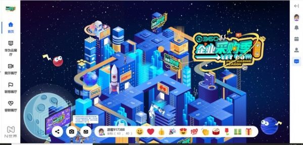 在元宇宙里开采购节是什么体验?恰逢企业开年采购季,360智慧商业携手元宇宙营销云平台N世界,重磅推出“2023年企业采购季元宇宙市集”,把采购节开到了元宇宙中,一站式解决企业开工采购需求,吸引了华为、联想、戴尔等头部企业的积极参与。全新的立体式展现形式、全新的互动参与方式,把企业采购节玩出了新花样。
