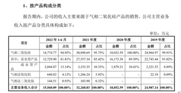从业务上看,汇富纳米主要拥有气相二氧化硅、气相法氧化铝、气相法二氧化钛等3大产品,其中气相二氧化硅产生的销售收入分别为24964.97万元、18052.59万元、30890.69万元、14774.77万元,分别占当期主营业务收入的99.91%、100%、95.75%、94.95%,为公司第一大产品。