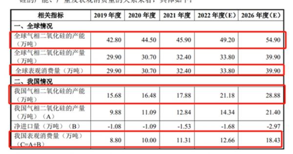 值得一提的是,根据SAGSI的统计,2019年至2021年,我国气相二氧化硅的产能分别为15.68万吨、16.48万吨、17.88万吨,消费量分别为8.8万吨、10万吨、11.31万吨;而全球气相二氧化硅产能为42.8万吨、44.5万吨、45.9万吨,消费量分别为29.9万吨、30.7万吨、32.4万吨。同时SAGSI预计,2026 年全球气相二氧化硅产能将达到54.9万吨,消费量为39.9万吨;我国气相二氧化硅的产能为28.88万吨,消费量为18.43万吨。这也意味着,气相二氧化硅已处于产能过剩。