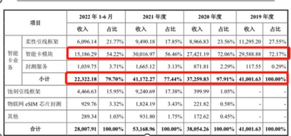 从业务上看,新恒汇主要拥有智能卡业务、蚀刻引线框架、物联网eSIM芯片封测,其中智能卡业务产生的销售收入分别为41001.63万元、37259.83万元、41172.27万元、22322.18万元,分别占当期主营业务收入的100%、97.91%、77.44%、79.7%,为第一大业务。