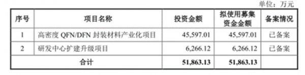 令人意想不到的是,新恒汇如此主要的业务在此次IPO募资中却未获得任何募集资金。招股说明书显示,新恒汇此次欲募集51863.13万元分别用于高密度QFN/DFN封装材料产业化项目、研发中心扩建升级项目,具体如下: