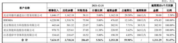 更为有意思的是,2019年-2021年,新恒汇向北京同德兴盛进出口贸易有限公司(下称“北京同德”)产生的销售收入分别为1026.66万元、947.6万元、1646.17万元,而2021年北京同德的逾期金额为1162.18万元,逾期期后6个月回款占比仅为2.58%。
