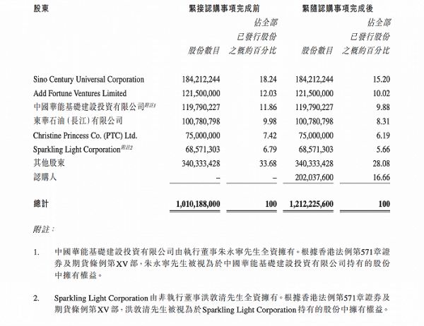 出售完成后,认购人持股比例合计为16.66%,超过罗田安方面;罗田安实控的Sino Century公司持股比例由18.24%降为15.2%;公司执行董事朱永宁全资拥有的中国华能基础建设投资有限公司持股9.88%,董事洪敦清全资拥有的Sparkling Light Corporation持股5.66%。