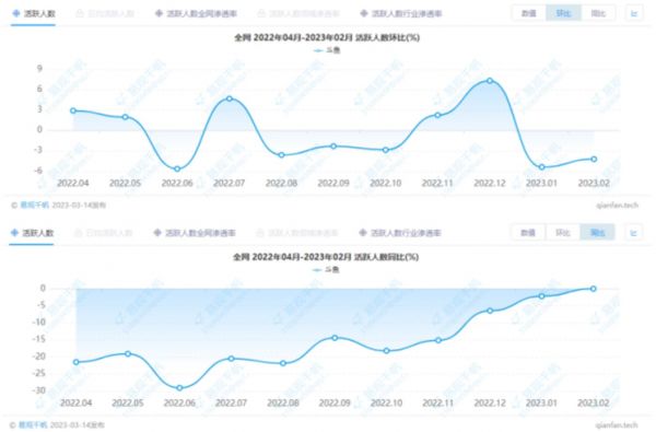 另据易观千帆数据显示,去年4月至今年2月的11个月里,斗鱼有6个月份的月活出现环比下降;而若从月活同比变化的角度来看,斗鱼在此期间月活几乎全部处于同比下滑的状态。