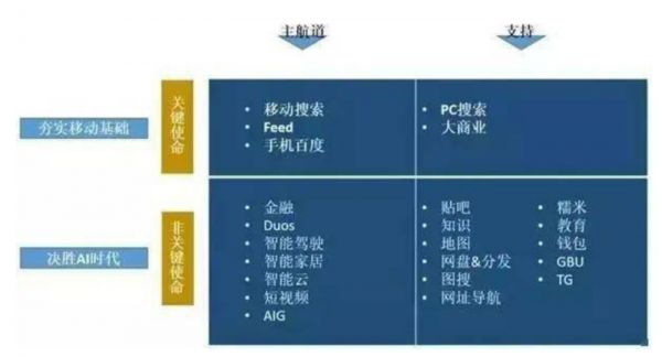 陆奇的到来,大有一番推动百度进行组织变革的气势,2017年的AI开发者大会舞台上,陆奇坚定地喊出:“All in AI!”他按照使命、主航道、护城河三个要素划出四个象限,和AI相关的业务被归为主航道+非关键使命,关键使命+主航道的定位给了移动搜索、feed流和手机。