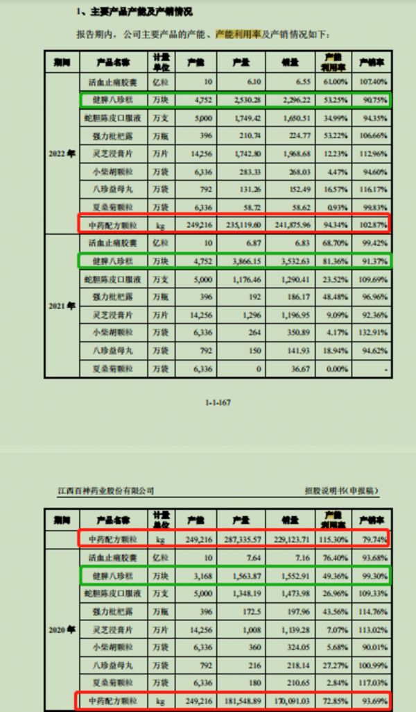 而报告期内,百神药业中药配方颗粒的产能未进行过扩充,保持在249.216吨水平,但产能利用率却忽高忽低。2022年末,中药配方颗粒的产能利用率为94.34%。由于2022年中药配方颗粒产品因执行新国标和省标后重新进院谈判及试点放开市场竞争加剧影响,百神药业中药配方颗粒的平均售价也逐年下降,报告期内分别为1601.79元/Kg、1567.69元/Kg、1350.95元/Kg。