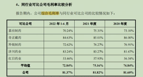 尽管百神药业主营业务毛利率在2022年出现下滑,不过其综合毛利率水平始终高于同行业可比公司均值。2020年、2021年以及2022年上半年,公司综合毛利率分别为、81.6%、81.82%、81.37%,而同行业可比公司毛利率平均值分别为74.84%、75.16%、72.84%。