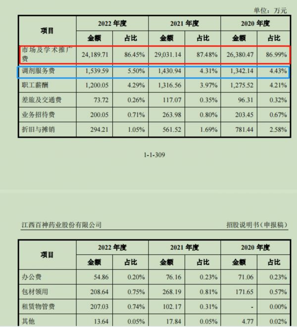 市场及学术推广费之外,调剂服务费也备受关注。根据招股书,2020-2022年,百神药业的调剂服务费分别为1342.14万元、1430.94万元、1539.59万元,占销售费用的比重分别为4.43%、4.31%、5.5%。