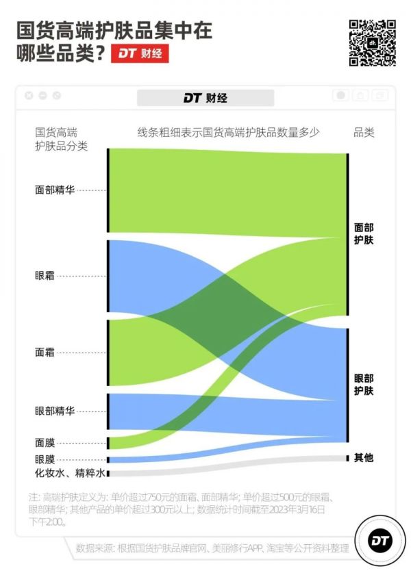 据DT财经统计,47款国货高端护肤品中,面部精华(14款)、眼霜(12款)和面霜(11款)是最多的。16个探入高端护肤市场的国货品牌中,有10个都推出了眼霜产品。