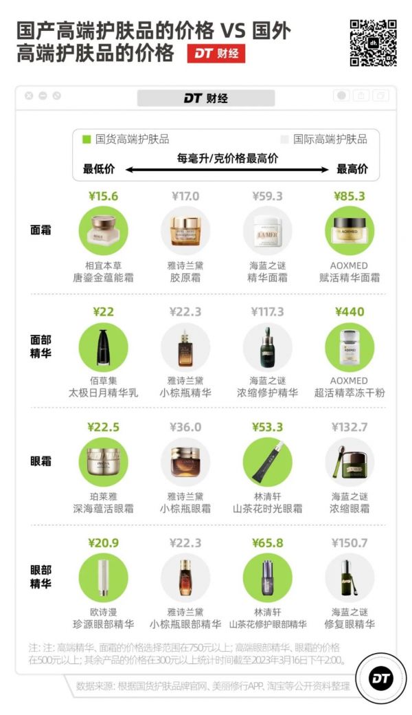 以高端国货面霜为例,最便宜的相宜本草唐奢养系列面霜,每克是15.6元;最贵的 AOXMED 生机霜,每克价格达到85.3元,甚至超出国际顶级护肤品海蓝之谜(LA MER)25元。