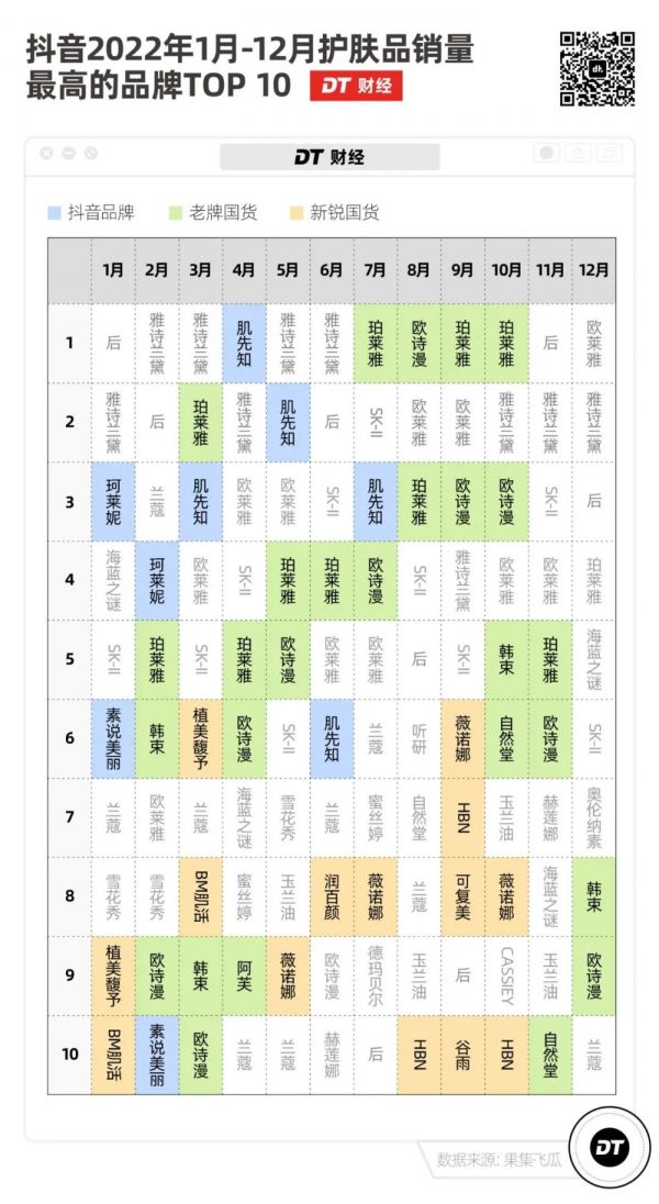 2022年1月-12月抖音护肤品销量榜中,最多的时候,榜单前10名里有6个是国货。