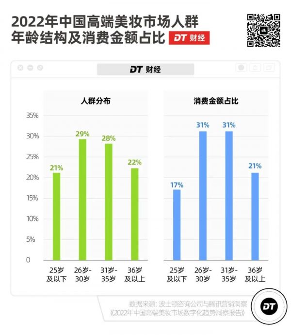 根据《2022年中国高端美妆市场数字化趋势洞察报告》,在各个年龄段中,26岁-30岁和31岁-35岁消费者所贡献的消费金额占比是最大的。而在所谓“贵妇”惯常指代的36岁及以上的人群中,消费金额占比仅比25岁及以下的年轻人多一点,后者通常是大学毕业后、工作三年以内的年轻人。