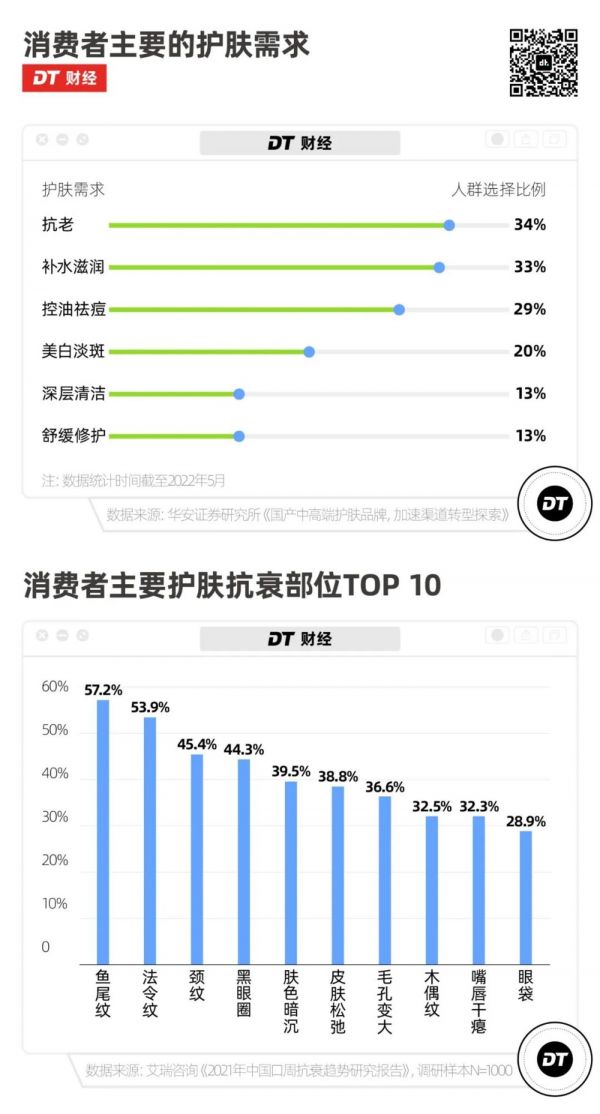 据华安证券《国产中高端护肤品牌,加速渠道转型探索》报告中的调研数据,抗老(34%)是消费者护肤最关心的问题。其次是补水滋润(33%)、控油祛痘(29%)。