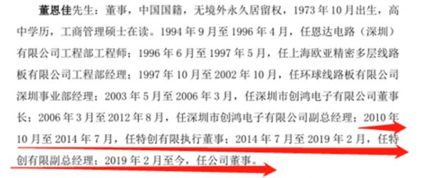 令人感到奇怪的是,纵观董恩佳的履历,其于2010年就在特创科技入职,并在2012年8月之后,除了特创科技的职务之外,也未有其他公司的职务。