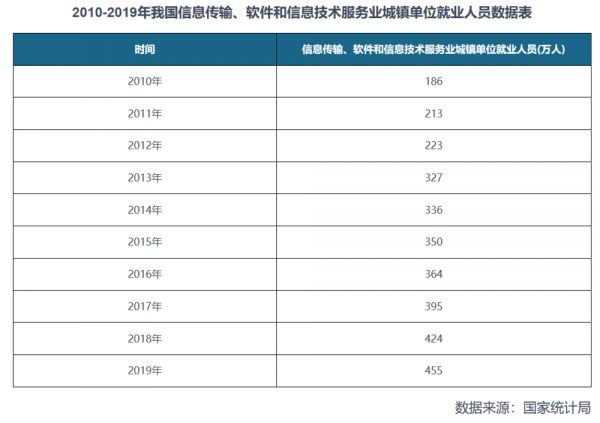 根据国家统计局公布的信息统计,2010年我国信息传输、软件和信息技术服务业城镇单位就业人员为186万,到2019年达到了455万。