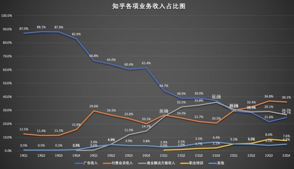 付费会员、职业培训、其他三分部业务收入同比有所增长,其中职业培训业务增速最快,成为知乎业务增长最快“黑马”。广告业务的持续拉垮,付费会员收入取代广告业务,在2022年成为知乎最大的收入来源。