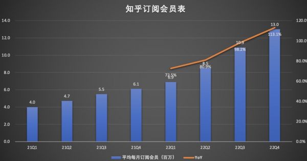 付费会员业务的增长主要受订阅会员持续增长推动。2018年,知乎推出了付费内容;2019年上半年,知乎推出了付费会员计划盐选。知乎付费会员收入大部分来源于盐选。数据显示,知乎第四季度月平均订阅会员数达到1300万,同比增长113.1%,2022年的平均MAUs为1.01亿。