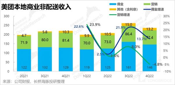 交易型业务所代表的佣金收入是 146 亿,同比增长 13.7%,增速和即配单量增长基本匹配;但反映流量分发和推广能力的广告类收入(主要来自到店类业务)收入 77.4 亿元,同比下降了 4.8%。