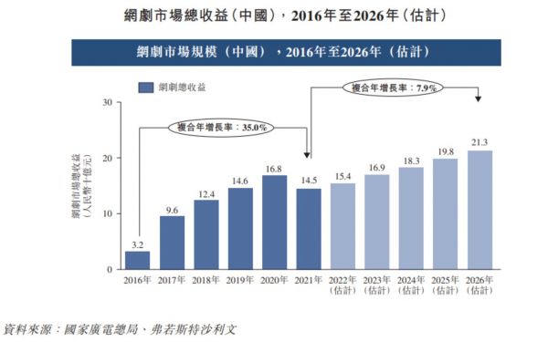 网剧或网络电影是依附于互联网诞生的新物种,未来发展存在更大想象空间。根据弗若斯特沙利文报告,从2021年至2026年,网剧市场规模将由145亿增长至213亿。招股书称,随着网络电影票房收入增速超越院线电影票房收入增速,预计网络电影将在电影市场中占据越来越重要的地位。