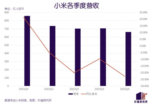 财报显示,小米四季度总营收为660亿元,高于市场预期的653亿元,同比下滑22.8%;2022财年总收入则为2800亿元,同比下滑14.7%。