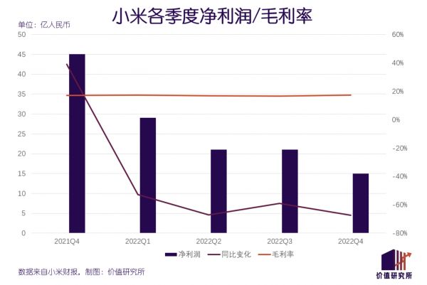 四季度小米经调整净利润约为15亿元,同比下滑67.3%,市场预期为13亿。比起营收,小米净利润的跌幅更加严重,且同样连续四个季度下滑。这也跟小米坚持高性价比路线、产品毛利率偏低有直接关系。